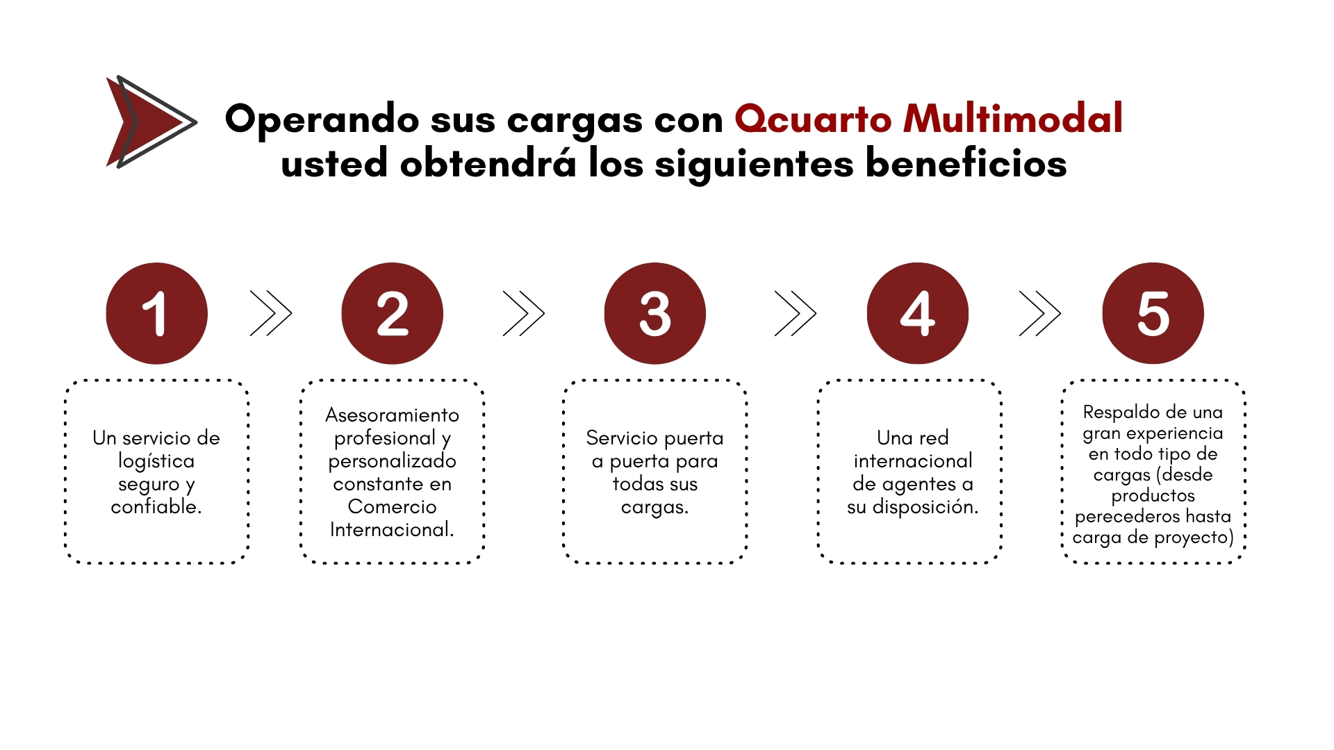 QCUARTO MULTIMODAL S.A. es una empresa de transporte de carga que está al servicio de los clientes de Paraguay, para esto, tiene alianzas estratégicas en distintos puntos del Mundo, además de contar con Partners de Miami y China. Somos una Empresa comprometida con nuestros valores y principios de Honestidad, Transparencia y Responsabilidad al servicio de nuestros clientes. Con el fin de satisfacer plenamente sus necesidades de transporte, QCUARTO con conocimiento profundo de mercado, ha implementado un sistema logístico seguro como agente de carga, lo que implica la integración de transporte, información, almacenamiento, manejo de materiales, embalaje y seguridad. QCUARTO tiene la capacidad de ofrecer soluciones rentables para cumplir con sus plazos de entrega de mercancías. Para ello contamos con un equipo de personas capacitadas que se destacan por su profesionalidad, calidez humana y dedicación al trabajo.